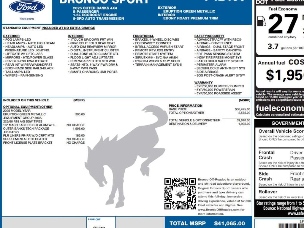 I got a 2025 Big Bend with the black diamond off road package. The steel modular front and rear in combination with bush guard gives this year model. A very aggressive off road look. With the ability to easily mount accessories and power them with the factory installed auxiliary switches. Hitch receiver seamlessly mounted into the rear steel bumper flanked by some very chunky recovery points. The upgraded aluminum rims wrapped with Continental all-terrains. It make this the most capable bronco sport yet. The interior of the 2025 has been updated with a new 13 inch touchscreen with Android Auto and apple car play. The lines of the dash flow elegantly from the new infotainment screen to the new all digital 12 inch gauge chaster. Toggling through the different modes on the gauge chaster is very intuitive, and all the displays are laid out very cleanly. Moving from gauge chaster the center storage cubby just below the infotainment screen there is a wireless charger and USB/ USB-c ports. The passenger side of that same cubby gets a handle and a matching one on the roof just in case the driver bucks a little too much. The passenger also gets a mesh storage area. That leads us to the fact this vehicle has tons of storage options all throughout. You have pockets on the sides of the front two seat big enough for the latest new phones. Very generous door storage on all four doors plus huge glove box and center console with 12 volt outlet. The back side of the center console has air vents and another 12 volt outlet plus a 110 outlet. Now getting to the cargo area it is massive for a crossover SUV. With off road package you get a cargo management system and a very nice rubber mat. Under that there is a full size tire plus scissor jack and funnel to use with the capless filler system. On the liftgate there isa pair of very bright led lights turned on with a switch in the cargo area. This feature packed vehicle has tons awesome gadgets and hidden a little homages I spend all day just talk that. At the end of the day it is car. So how does it drive. It is wonderful, the steering and pedal response is beautiful. Rides very smooth and little to no road noise going down the highway. The active cruise control and co-pilot 360 have been very handy. The car literally drives itself most of the time. There is not enough good things I could same about this car. I love it and you pick one too. You will see what I mean.… - 5.0