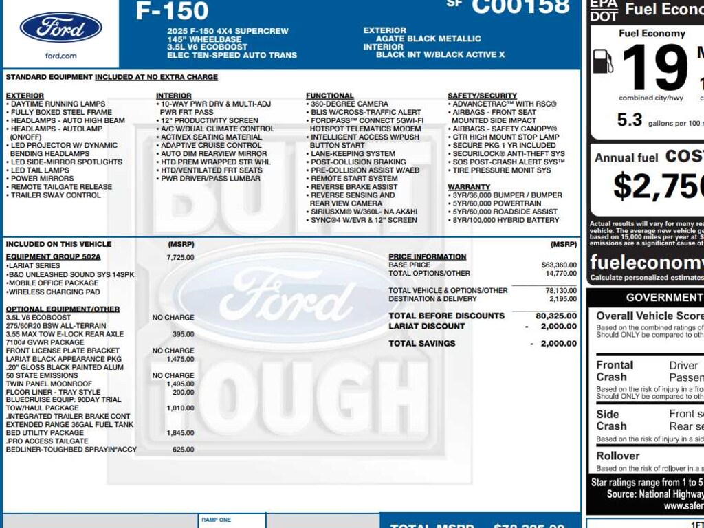 Navigation, Heated Driver Seat, Cooled Driver Seat, Back-Up Camera, Satellite Radio Ford LARIAT with Agate Black Metallic exterior and Black interior features a V6 Cylinder Engine with 400 HP at 6000 RPM*.