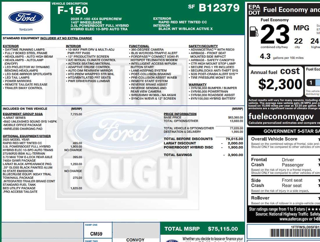 Navigation, Heated Driver Seat, Cooled Driver Seat, Back-Up Camera, Satellite Radio. Ford LARIAT with Rapid Red Metallic Tinted Clearcoat exterior and Black interior features a V6 Cylinder Engine with 430 HP at 6000 RPM*.