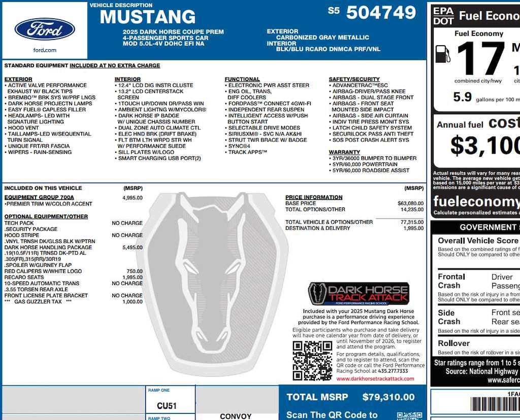 Navigation, Heated Driver Seat, Back-Up Camera, Premium Sound System, Satellite Radio Ford Dark Horse with Carbonized Gray Metallic exterior and Black w/Blue Accents interior features a 8 Cylinder Engine with 500 HP at 5000 RPM*.