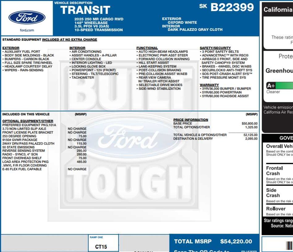 Back-Up Camera, iPod/MP3 Input, WiFi Hotspot. Ford Transit Cargo Van with Oxford White exterior and Dark Palazzo Gray interior features a V6 Cylinder Engine with 275 HP at 6250 RPM*.