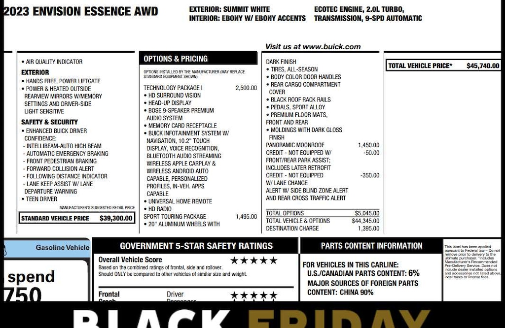 includes (UD5) Front and Rear Park Assist, (UV2) HD Surround Vision, (IOU) 10.2" diagonal Buick Infotainment system with navigation, (UQS) Bose 9-speaker audio system, (MCR) memory card receptacle, (U2L) HD Radio, (UV6) Head-Up Display and (UG1) Universal Home Remote (Beginning with start of production, vehicles will be forced to include (00Z) Not Equipped with Front and Rear Park Assist, which removes Front and Rear Park Assist. See dealer for details or the window label for the features on a specific vehicle. includes (PYS) 20" wheels with Dark finish, unique ST Badging, Dark finish grille surround and mesh inserts, (V5H) Black roof rails, (D75) body-color door handles, (PJV) lower trim/wheel arch moldings, exhaust bezels, window trim and mirror caps with Dark Gloss finish, (CGY) rear cargo compartment cover, headrests with the Sport Touring logo, (B50) Carpeted front floor mats with Sport Touring logo and rear floor mats and (JF5) sport pedals (Includes Red seat stitching. MOONROOF, POWER, PANORAMIC, TILT-SLIDING, includes multi-touch display, AM/FM/SiriusXM stereo, Bluetooth® streaming audio for music and most phones, Wireless Apple CarPlay®/Wireless Android Auto® for compatible phones, advanced voice recognition, in-vehicle apps, personalized profiles for infotainment and vehicle settings. Includes greater memory, (228 hp [170 kW] @ 5000 rpm, 258 lb-ft of torque [350 N-m] @ 1500-4000 rpm) (STD), (STD).