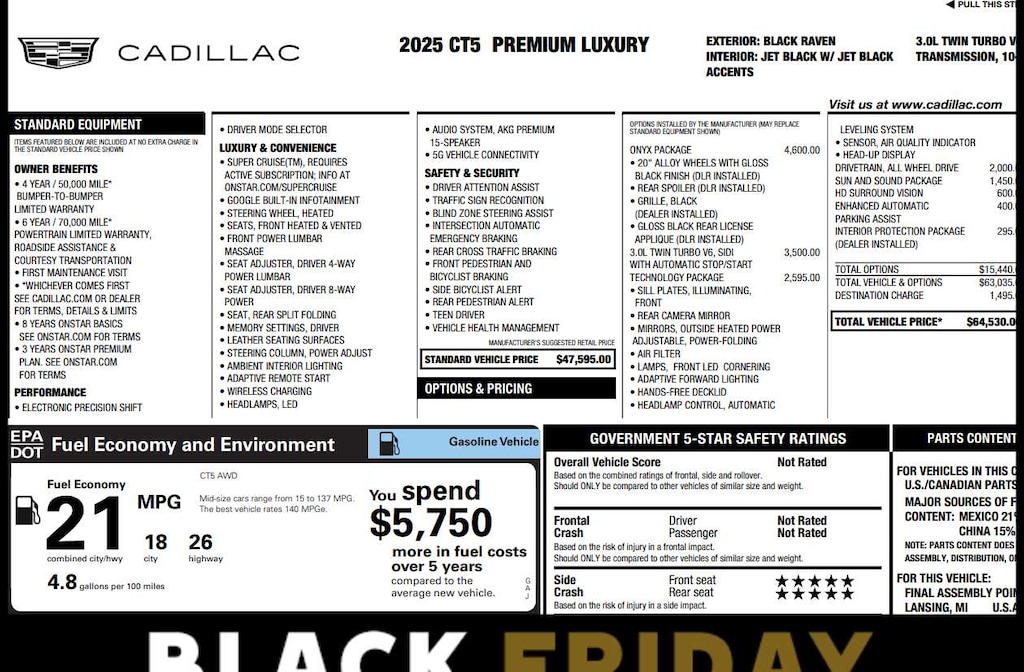 includes (SSJ) 20 alloy wheels with Gloss Black finish, LPO, (SPZ) Black Wheel Locks, LPO, (SPY) Black Wheel lug nuts, LPO, (RIK) Gloss Black nameplates, LPO, (5JS) Black mirror caps, LPO, (5XR) Black grille, LPO and (RXX) Gloss Black rear license plate applique, LPO (Includes (5V5) Black Rear spoiler, LPO. with Automatic Stop/Start (335 hp [250 kW] @ 5400 rpm, 405 lb-ft of torque [550 N-m] @ 2350-4000 rpm), (Includes (QES) 255/35ZR20 all-season, run-flat tires. includes (DXR) outside heated power-adjustable, body-color, power-folding and driver-side auto-dimming with integrated turn signal indicators, (DRZ) Rear Camera Mirror, (TL3) Hands-Free decklid release, (K6L) Pollutant, odor and fine dust air filter, (USK) air quality sensor, (UV6) Head-Up Display, (T95) Adaptive Forward Lighting headlamps, (TR7) Automatic leveling headlamp system, (UWN) Premium headlamp system, (T87) front cornering lamps and (B7G) illuminating front sills with Cadillac crest logo, DRIVETRAIN, ALL-WHEEL DRIVE, includes (C3U) sunroof and (UQS) AKG Premium Audio, HD SURROUND VISION, ENHANCED AUTOMATIC PARKING ASSIST, includes (VAV) All-weather floor mats, LPO and (VLI) All-weather cargo mat, LPO, TRANSMISSION, 10-SPEED AUTOMATIC.