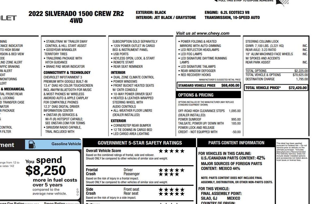 Heated/Cooled Leather Seats, Sunroof, Heated Rear Seat, Rear Air, Alloy Wheels, Bed Liner, LPO, OFF-ROAD HIGH CLEARANCE STEPS, TRANSMISSION, 10-SPEED AUTOMATIC, ENGINE, 6.2L ECOTEC3 V8, AUDIO SYSTEM, CHEVROLET INFOTAINMENT..