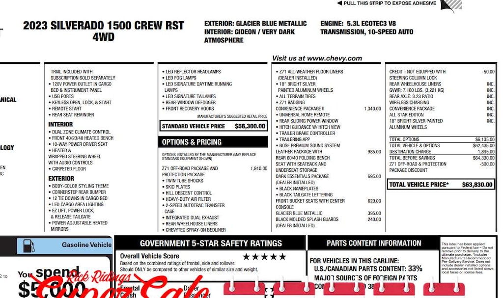 (355 hp [265 kW] @ 5600 rpm, 383 lb-ft of torque [518 Nm] @ 4100 rpm); featuring available Dynamic Fuel Management that enables the engine to operate in 17 different patterns between 2 and 8 cylinders, depending on demand, to optimize power delivery and efficiency, includes (UG1) Universal Home Remote, (A48) rear sliding power window, (PZ8) Hitch Guidance with Hitch View, (JL1) Trailer brake controller and (UET) Trailering App Includes (UQA) Bose Premium Sound System.), includes (Z71) Off-Road suspension, (JHD) Hill Descent Control, (NZZ) skid plates and (K47) heavy-duty air filter Includes Z71 hard badge, (N10) dual exhaust, (RCV) 18" bright silver painted wheels, (XCK) 265/65R18 all-terrain, blackwall tires and (NQH) 2-speed transfer case. includes (B1J) wheel house liners and (CGN) Chevytec spray-on bedliner, with center console (Includes (EPH) Electronic Transmission Range Selector (console mounted). with Google built-in, 13.4" diagonal HD color touchscreen, includes multi-touch display, AM/FM stereo, Bluetooth® streaming audio for music and most phones; featuring wireless Android Auto® and Apple CarPlay® capability for compatible phones, advanced voice recognition, in-vehicle apps, personalized profiles for infotainment and vehicle settings (STD), with Electronic Transmission Range Selector, (ETRS), electronically controlled with overdrive, tow/haul mode and steering column paddle shifters. Includes Cruise Grade Braking and Powertrain Grade Braking, 60/40 folding bench for Crew Cab models, includes full-length bench seat, seatback storage on left and right side, center fold out armrest with 2 cupholders, full cab width under-seat storage, (includes child seat top tether anchor).