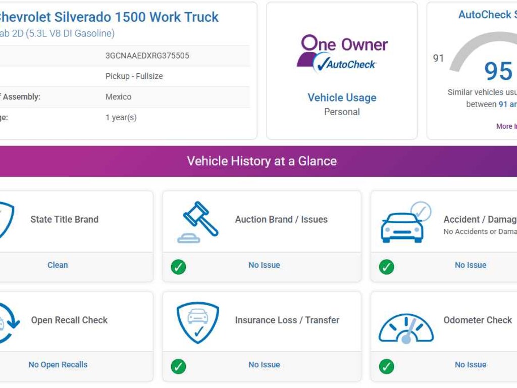 AutoCheck One Owner This Silverado 1500 is priced $200 below Kelley Blue Book.