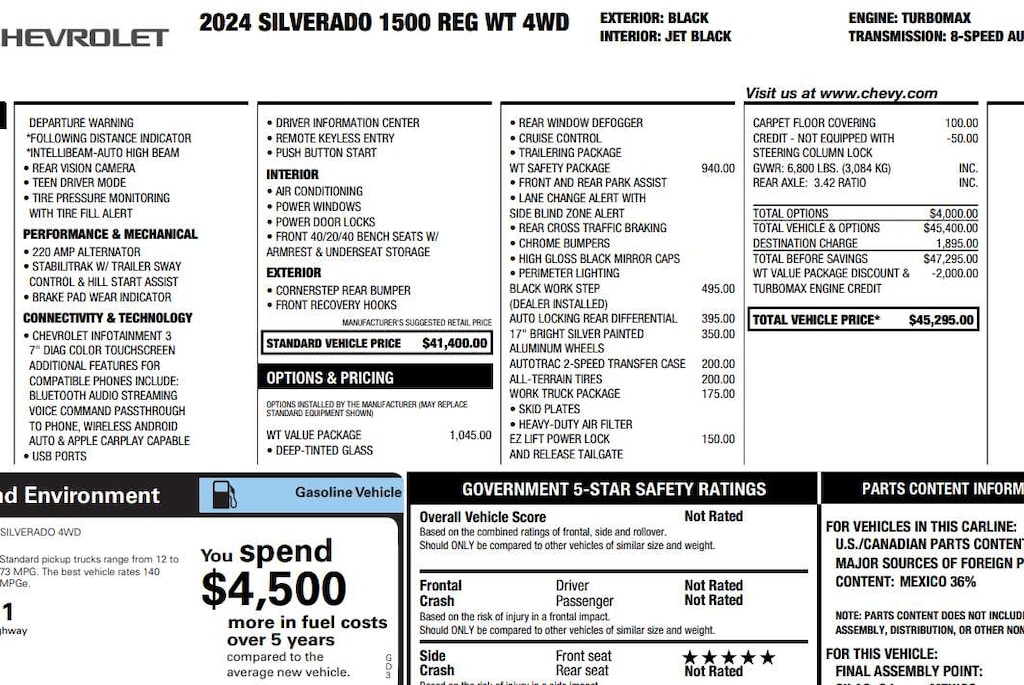 WT VALUE PACKAGE: includes (PCV) WT Convenience Package and (Z82) Trailering Package, includes (UD5) Front and Rear Park Assist, (UKC) Lane Change Alert with Side Blind Zone Alert, (UFB) Rear Cross Traffic Braking, (V46) Chrome front bumper, (VJH) Chrome rear bumper, (UKK) Rear Pedestrian Alert and (DP6) high gloss Black mirror caps (Includes (U12) Perimeter Lighting. includes (AKO) tinted windows, (C49) rear-window defogger and (K34) cruise control, (dealer-installed), AUTO-LOCKING REAR DIFFERENTIAL, WHEELS, 17" X 8" (43.2 CM X 20.3 CM) BRIGHT SILVER PAINTED ALUMINUM, GLASS, DEEP-TINTED, 7" diagonal HD color touchscreen, AM/FM stereo, Bluetooth® audio streaming for 2 active devices, voice command pass-through to phone, Wireless Apple CarPlay® and Wireless Android Auto® compatibility (STD), with overdrive and tow/haul mode. Includes Cruise Grade Braking and Powertrain Grade Braking (STD).