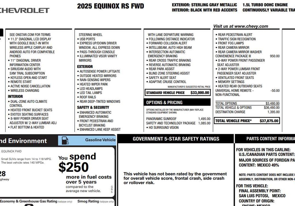 Navigation, Power Liftgate, Satellite Radio, iPod/MP3 Input, Onboard Communications System. Chevrolet FWD RS with Sterling Gray Metallic exterior and Black with Red Accents interior features a 4 Cylinder Engine with 175 HP at 5600 RPM*.