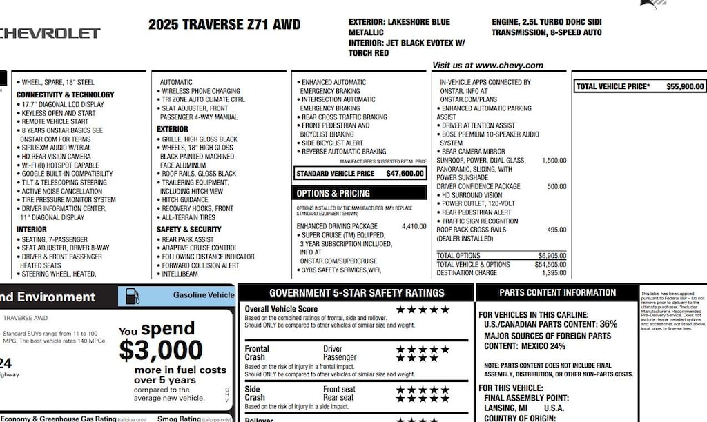 ENHANCED DRIVING PACKAGE includes (UKL) Super Cruise, (UKZ) Enhanced Automatic Parking Assist, (ULM) Driver ATTENTION ASSIST® and (UQA) Bose premium 12-speaker audio system Also includes (DRZ) Rear Camera Mirror.), SUNROOF, POWER, DUAL GLASS, PANORAMIC, SLIDING, WITH POWER SUNSHADE, DRIVER CONFIDENCE PACKAGE includes (KI6) 120V-volt power outlet, (UKK) Rear Pedestrian Alert, (UV2) HD Surround Vision and (UVX) Traffic Sign Recognition, LPO, ROOF CROSS RAILS, ENGINE, 2.5L TURBO DOHC SIDI WITH VARIABLE VALVE TIMING (VVT) (328 hp [244 kW] @ 5500 rpm, 326 lb-ft of torque [442 N-m] @ 3500 rpm) (STD), TRANSMISSION, 8-SPEED AUTOMATIC (STD). AutoCheck One Owner