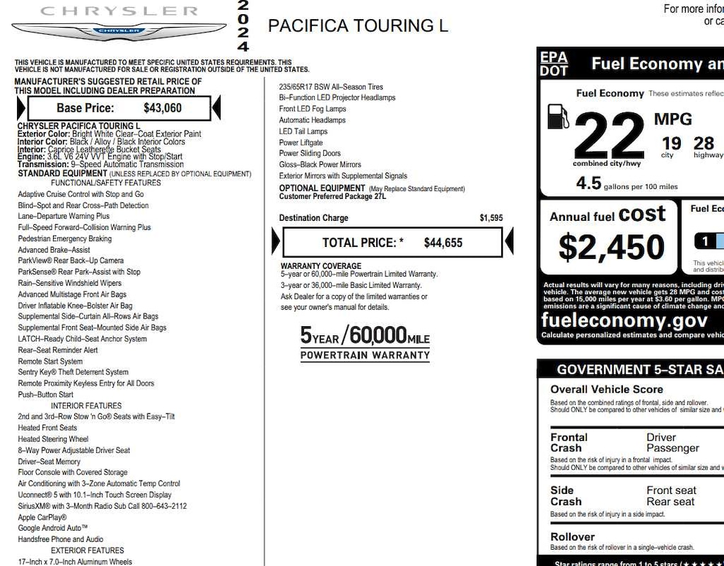 Touring L trim. FUEL EFFICIENT 28 MPG Hwy/19 MPG City! Heated Seats, Third Row Seat, Rear Air, Captains Chairs, Power Liftgate, ENGINE: 3.6L V6 24V VVT UPG I W/ESS, TRANSMISSION: 9-SPEED 948TE AUTOMATIC... Aluminum Wheels.