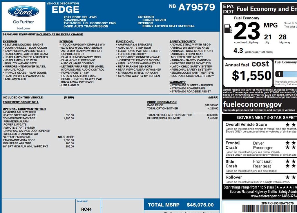 PANORAMIC VISTA ROOF power open/close w/power shade, Standard 2nd row LED dome light is replaced w/2 single lights, Switch located in each grab handle pocket, CONVENIENCE PACKAGE Wireless Charging Pad, SecuriCode Keyless Entry Keypad, Universal Garage Door Opener (UGDO), Perimeter Alarm, Power Liftgate, Remote Start System, Fog Lamps w/Chrome Bezel, 110V/150W AC Power Outlet, WHEELS: 18 BRIGHT-MACHINED ALUMINUM premium dark stainless-painted pockets, HEATED STEERING WHEEL, ENGINE: TWIN-SCROLL 2.0L ECOBOOST auto start-stop technology (STD).