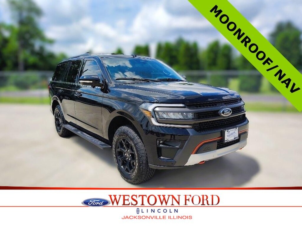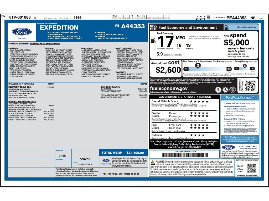 Equipment Group 501A High Package: 18 Ebony-Painted Wheels; Heated and Ventilated Leather Front Captain's Chairs; 2nd Row Leather Trimmed Pwr-Folding Captain's Chairs; 3.5L V6 EcoBoost High Output Engine; ControlTrac with 3.73 Axle Ratio; 7. 450 lbs GVWR; Instrument Panel Cluster; Heated Steering Wheel; 2nd Row Power Windows; B&O Sound System by Bang and Olufsen; Power-Folding Sideview Mirrors with Autofold; Front & Rear Upgraded Carpet Floor Mats; 15.5 LCD Capacitive Touchscreen; 10-Speed Automatic Transmission with SelectShift; Vinyl Center Console; Panoramic Vista Roof; Rain-Sensing Wipers (front Only); P260/70R18E AT BSW Tires; Ambient Lighting. Ford Co-Pilot360 Assist 2.0: Connected Built-In Navigation; Reverse Brake Assist; 360-Degree Camera with Split View. Panoramic Vista Roof. Heavy-Duty Trailer Tow Package. Advanced Cargo Manager. **Equipment listed is based on original vehicle build and subject to change. Please confirm the accuracy of the included equipment by calling the dealer prior to purchase.**