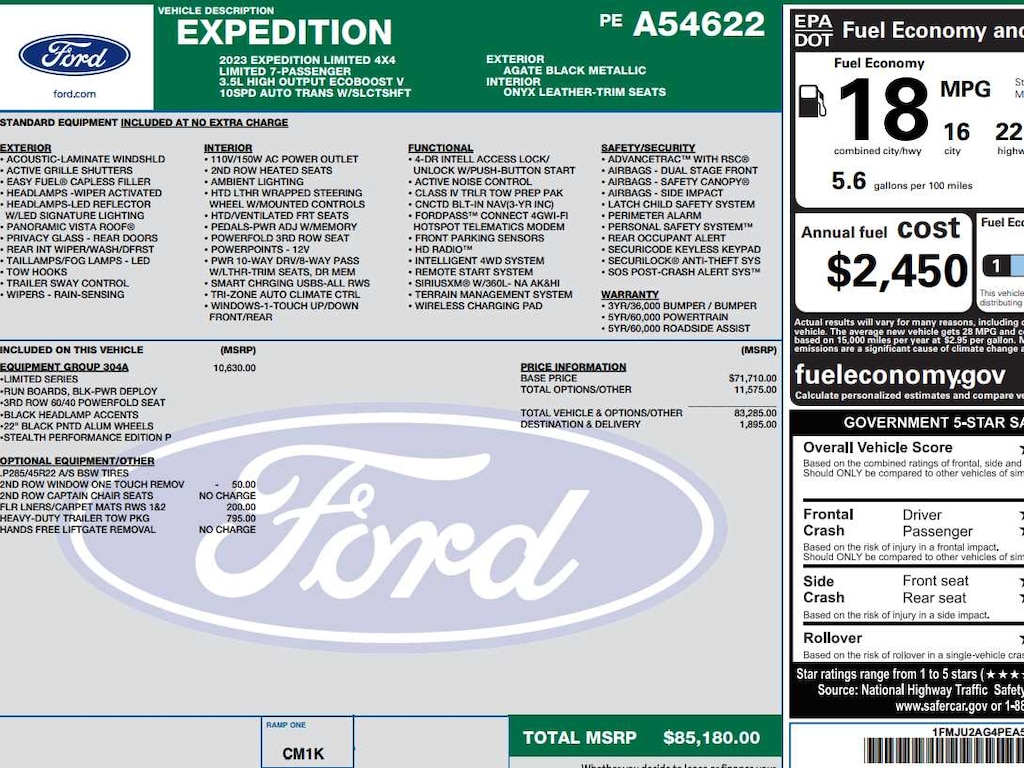1st & 2nd Row Floor Mats w/Logo, Ford Co-Pilot360 Assist 2.0, Connected Built-In Navigation, 3 years of service, pinch-to-zoom capability, live traffic, predictive destinations and route guidance, Reverse Brake Assist, 360-Degree Camera w/Split View, front/rear washer, Engine: 3.5L V6 EcoBoost High Output, Wheels: 22 Premium Black-Painted Aluminum, Stealth Performance Edition Package, Sport Center Console, Black Roof Rack Side Rails, Black Limited Tailgate Badge, LED Taillamp w/Black Bezels, Black Headlamp and Fog Lamp Bezels, Expedition Lettering on Hood, Ebony Black Bar and Mesh Grille, Ebony Black Tailgate Applique, Active Noise Control, engine sound enhancement, Body Color Door Handles, Power-Folding Sideview Mirrors w/Autofold, power and heated glass, turn signal indicators, security, 3.73 Axle Ratio, non-limited-slip rear axle, Integrated Trailer Brake Controller, 26mm Engine Radiator, Pro Trailer Backup Assist, 2-Speed Automatic 4WD, neutral towing capability, 360-Degree Camera w/Trailer Reverse Guidance, (STD).