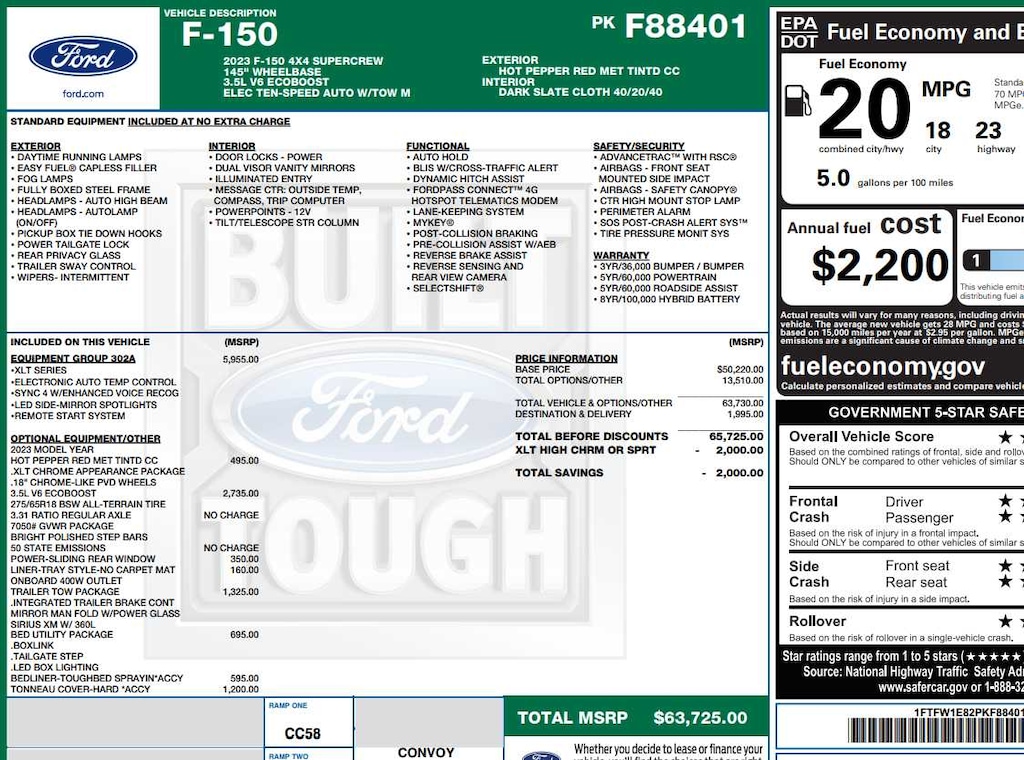EQUIPMENT GROUP 302A HIGH Class IV Trailer Hitch Receiver, towing capability up to TBD lbs, on 3.3L V6 PFDI engine (99B) and 2.7L EcoBoost engine (99P) or up to TBD lbs, on 3.5L EcoBoost engine (998) and 5.0L V8 engine (995), 7/4-pin connector, class IV trailer hitch receiver, smart trailer tow connector ( BLIS w/trailer tow coverage where BLIS is available), XLT Chrome Appearance Package, lower grille trim, Chrome Single-Tip Exhaust, Tires: 275/65R18 BSW Automatic Transmission, Chrome Door & Tailgate Handles w/Body-Color Bezel, bezel on side doors and black on tailgate, Wheels: 18 Chrome-Like PVD, 2-Bar Style Grille w/Chrome 2 Minor Bars, silver painted surround and black background mesh, Bright Polished Step Bars, Zone Lighting, Intelligent Access w/Push Button Start, approach detection, SecuriCode, ENGINE: 3.5L V6 ECOBOOST GVWR: 7,050 lbs Payload Package, 3.31 Axle Ratio, HARD FOLDING TONNEAU PICKUP BOX COVER, BED UTILITY PACKAGE BoxLink, 4 premium locking cleats, Zone Lighting, LED Box Lighting, Tailgate Step w/Tailgate Work Surface, TOUGH BED SPRAY-IN BEDLINER, TRANSMISSION: ELECTRONIC 10-SPEED AUTOMATIC selectable drive modes: normal, ECO, sport, tow/haul, slippery, deep snow/sand and mud/rut (STD).