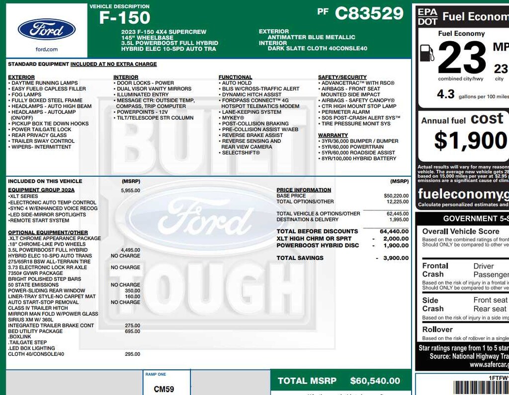 Class IV Trailer Hitch Receiver, towing capability up to TBD lbs, on 3.3L V6 PFDI engine (99B) and 2.7L EcoBoost engine (99P) or up to TBD lbs, on 3.5L EcoBoost engine (998) and 5.0L V8 engine (995), 7/4-pin connector, class IV trailer hitch receiver, smart trailer tow connector ( BLIS w/trailer tow coverage where BLIS is available), XLT Chrome Appearance Package, lower grille trim, Chrome Single-Tip Exhaust, Tires: 275/65R18 BSW Automatic Transmission, Chrome Door & Tailgate Handles w/Body-Color Bezel, bezel on side doors and black on tailgate, Wheels: 18 Chrome-Like PVD, 2-Bar Style Grille w/Chrome 2 Minor Bars, silver painted surround and black background mesh, Bright Polished Step Bars, Zone Lighting, Intelligent Access w/Push Button Start, approach detection, SecuriCode Drivers Side Keyless-Entry, Electronic Locking w/3.73 Axle Ratio, GVWR: 7,350 lbs Payload Package, Dual Zone Electronic Automatic Temperature Control, BoxLink, 4 premium locking cleats, Zone Lighting, LED Box Lighting, Tailgate Step w/Tailgate Work Surface.