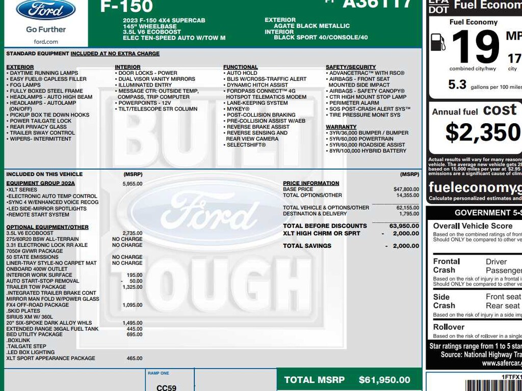 EQUIPMENT GROUP 302A HIGH Class IV Trailer Hitch Receiver, towing capability up to TBD lbs, on 3.3L V6 PFDI engine (99B) and 2.7L EcoBoost engine (99P) or up to TBD lbs, on 3.5L EcoBoost engine (998) and 5.0L V8 engine (995), 7/4-pin connector, class IV trailer hitch receiver, smart trailer tow connector ( BLIS w/trailer tow coverage where BLIS is available), XLT Chrome Appearance Package, lower grille trim, Chrome Single-Tip Exhaust, Tires: 275/65R18 BSW Automatic Transmission, Chrome Door & Tailgate Handles w/Body-Color Bezel, bezel on side doors and black on tailgate, Wheels: 18 Chrome-Like PVD, 2-Bar Style Grille w/Chrome 2 Minor Bars, silver painted surround and black background mesh, Bright Polished Step Bars, Zone Lighting, Intelligent Access w/Push Button Start, approach detection, SecuriCode, ENGINE: 3.5L V6 ECOBOOST 3.31 Axle Ratio, GVWR: 7,050 lbs Payload Package, WHEELS: 20 6-SPOKE DARK ALLOY PAINTED ALUMINUM Tires: 275/60R20 BSW AT, BED UTILITY PACKAGE BoxLink, 4 premium locking cleats, Zone Lighting, LED Box Lighting, Tailgate Step w/Tailgate Work Surface, XLT SPORT APPEARANCE PACKAGE body-color wheellip moldings and unique interior finish, Box Side Decals, Chrome Single-Tip Exhaust, Body-Color Door & Tailgate Handles, body-color bezel on side doors and black on tailgate, Tires: 275/65R18 BSW Automatic Transmission, Wheels: 18 6-Spoke Machined Aluminum, gloss black painted pockets, Accent-Color Step Bars, Body-Color Front & Rear Bumpers, body-color front fascia, Black 2-Bar Style Grille w/Black Surround/Accents, ELECTRONIC LOCKING W/3.31 AXLE RATIO, TRANSMISSION: ELECTRONIC 10-SPEED AUTOMATIC selectable drive modes: normal, ECO, sport, tow/haul, slippery, deep snow/sand and mud/rut (STD).