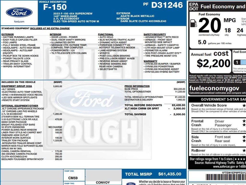 Class IV Trailer Hitch Receiver, towing capability up to TBD lbs, on 3.3L V6 PFDI engine (99B) and 2.7L EcoBoost engine (99P) or up to TBD lbs, on 3.5L EcoBoost engine (998) and 5.0L V8 engine (995), 7/4-pin connector, class IV trailer hitch receiver, smart trailer tow connector ( BLIS w/trailer tow coverage where BLIS is available), XLT Chrome Appearance Package, lower grille trim, Chrome Single-Tip Exhaust, Tires: 275/65R18 BSW Automatic Transmission, Chrome Door & Tailgate Handles w/Body-Color Bezel, bezel on side doors and black on tailgate, Wheels: 18 Chrome-Like PVD, 2-Bar Style Grille w/Chrome 2 Minor Bars, silver painted surround and black background mesh, Bright Polished Step Bars, Zone Lighting, Intelligent Access w/Push Button Start, approach detection, SecuriCode Drivers Side Keyless-Entry, 3.55 Axle Ratio, GVWR: 6,600 lbs Payload Package, trailer reverse guidance, TOUGH BED SPRAY-IN BEDLINER, ELECTRONIC LOCKING W/3.55 AXLE RATIO, selectable drive modes: normal, ECO, sport, tow/haul, slippery, deep snow/sand and mud/rut (STD).