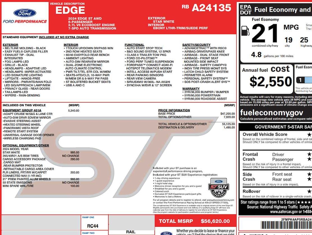 Leather Seats, All Wheel Drive, Back-Up Camera, Turbocharged, Premium Sound System Ford ST with Star White Metallic Tri-Coat exterior and Ebony interior features a V6 Cylinder Engine with 335 HP at 5500 RPM*.