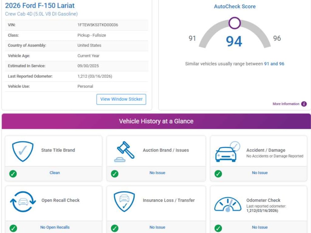 See ford.com/bluecruise for version details, Note: Select option to purchase BlueCruise hardware and a one-time purchase of BlueCruise, Without selecting this option, or the 1 year + 90-day plan by selecting (521) at the time of vehicle order, vehicle will never be capable of BlueCruise functionality, BlueCruise service will be active for a minimum of 7 years on this vehicle (non-transferrable to another VIN), No additional subscription purchase will be required to maintain BlueCruise service beyond the 7 years if the service is available, unlimited Wi-Fi hotspot, audio and video streaming, connected navigation, voice assistant and entertainment, Select option for a 1-time purchase of Ford Connectivity Package, Ford Connectivity Package will be active for 7 years on this vehicle (non-transferable to another VIN) from warranty start date, Requires activation via Ford app, Not available for fleet orders, Evolving technology/cellular networks/vehicle capability may limit functionality and prevent operation of connected features, Ford may temporarily slow data speeds if such data usage reaches or exceeds 50GB within a billing cycle or due to network limitations, If a customer uses more than 50% of their data usage in a roaming country during a 60-day period, Ford may remove or limit the customers data plan, DRIVERS SIDE SECURICODE KEYLESS-ENTRY KEYPAD, SelectShift w/progressive range select and selectable drive modes: normal, ECO, sport, tow/haul, slippery and trail (STD). AutoCheck One Owner