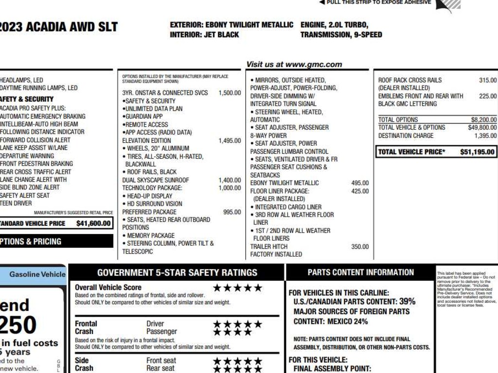 ELEVATION EDITION includes Black grille and exterior accents, (QGY) 20 aluminum wheels, Black center caps, (QNU) 20 all-season blackwall tires and (V59) Gloss Black roof rails, SUNROOF, DUAL SKYSCAPE 2-PANEL POWER with tilt-sliding front and fixed rear with sunscreen, TECHNOLOGY PACKAGE includes (UV2) HD Surround Vision and (UV6) Head Up Display, LPO, FLOOR LINER PACKAGE includes (RIA) front and second row all-weather floor liner, LPO, (RIB) third row all-weather floor liner, LPO and (CAV) integrated cargo liner, LPO, TRAILER HITCH, FACTORY INSTALLED, 1000 LBS. TOWING with 7-pin wiring harness, LPO, ROOF RACK CROSS RAILS, AUDIO SYSTEM, 8 DIAGONAL GMC INFOTAINMENT SYSTEM WITH NAVIGATION includes multi-touch display, AM/FM/SiriusXM stereo, Bluetooth® streaming audio for music and most phones, Android Auto® and Apple CarPlay® capability for compatible phones, advanced voice recognition, in-vehicle apps, personalized profiles for infotainment and vehicle settings (STD), ENGINE, 2.0L TURBO, 4-CYLINDER, SIDI with Variable Valve Timing (VVT) (228 hp [171 kW] @ 5000 rpm, 258 lb-ft of torque [349.8 N-m]) @ 1500 - 4000 rpm (STD), TRANSMISSION, 9-SPEED AUTOMATIC, ELECTRONICALLY-CONTROLLED with 2.0L Turbo engine (STD), LUXURY PACKAGE includes (AAB) Memory Package for power driver seat and outside mirrors, (A7K) 8-way power front passenger seat adjuster, (DYX) outside heated power-adjustable power-folding body-color mirrors with driver-side auto-dimming with integrated turn signal indicators, (AT9) power passenger lumbar control, (KU9) heated and ventilated driver and front passenger seats, (KA6) heated rear outboard seats and (N38) power tilt and telescopic steering column.