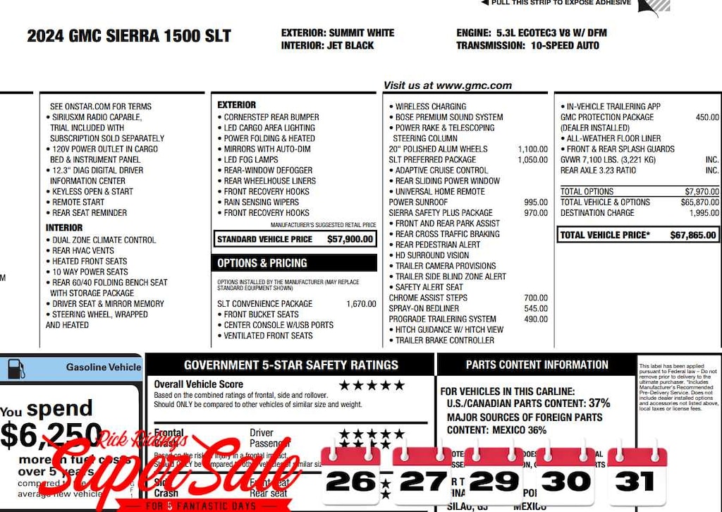 includes (A50) bucket seats with (D07) center console, (KQV) ventilated front seats, (K4C) Wireless Charging, (UQA) Bose Premium Audio System, (N38) Power Rake/ Telescoping steering column and (UBC) USB ports, 2 (first row) Charge and Data ports located inside armrest, with technical gray painted accents, Includes (KSG) Adaptive Cruise Control, (A48) rear sliding power window, (UG1) Universal Home Remote and (KA6) heated second row outboard seats, SUNROOF, POWER, includes (UD5) Front and Rear Park Assist, (UFB) Rear Cross Traffic Braking, (UKK) Rear Pedestrian Alert, (TRG) Trailer Camera Provisions, (UKV) Trailer Side Blind Zone Alert and (UV2) HD Surround Vision (Includes (HS1) Safety Alert Seat. ASSIST STEPS, CHROME WHEEL TO WHEEL, Pickup bedliner with GMC logo, Bluetooth® streaming audio for music and most phones; featuring wireless Android Auto® and Apple CarPlay® capability for compatible phones (STD), (355 hp [265 kW] @ 5600 rpm, 383 lb-ft of torque [518 Nm] @ 4100 rpm); featuring Dynamic Fuel Management (STD), with overdrive, and tow/haul mode and steering column paddle shifters. Includes Cruise Grade Braking and Powertrain Grade Braking.