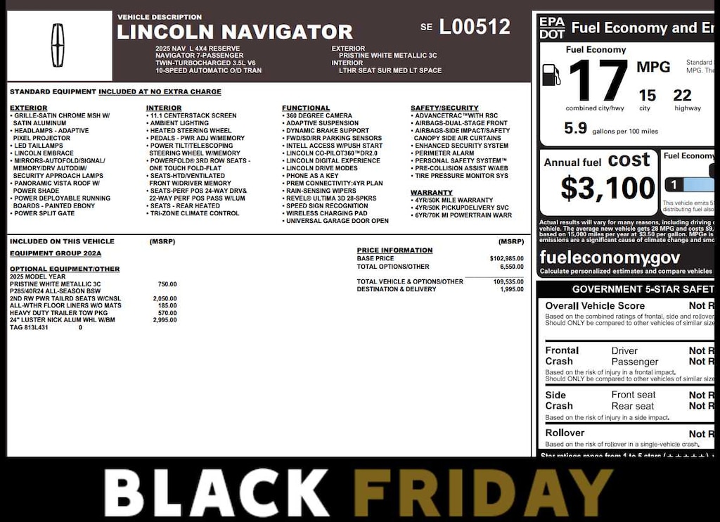 WHEELS: 24 LUSTER NICKEL ALUMINUM bright machined finish, Tires: P285/40R24 All-Season BSW, 2ND ROW HEATED & VENTILATED DUAL CAPTAINS CHAIR massage w/power tailored seats and 40/console/40 seat structure (console w/5.8 LCD touchscreen and multimedia audio controls), TRANSMISSION: 10-SPEED AUTOMATIC SelectShift capability (STD). AutoCheck One Owner