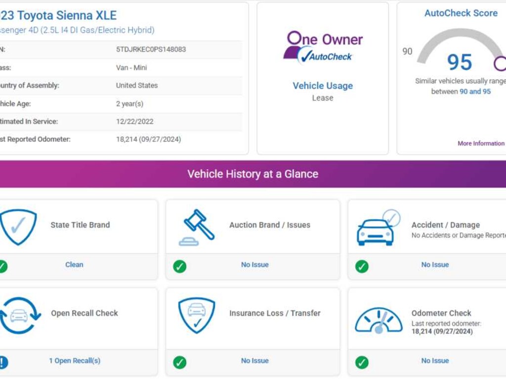 AutoCheck One Owner This Sienna is priced $3,900 below Kelley Blue Book.